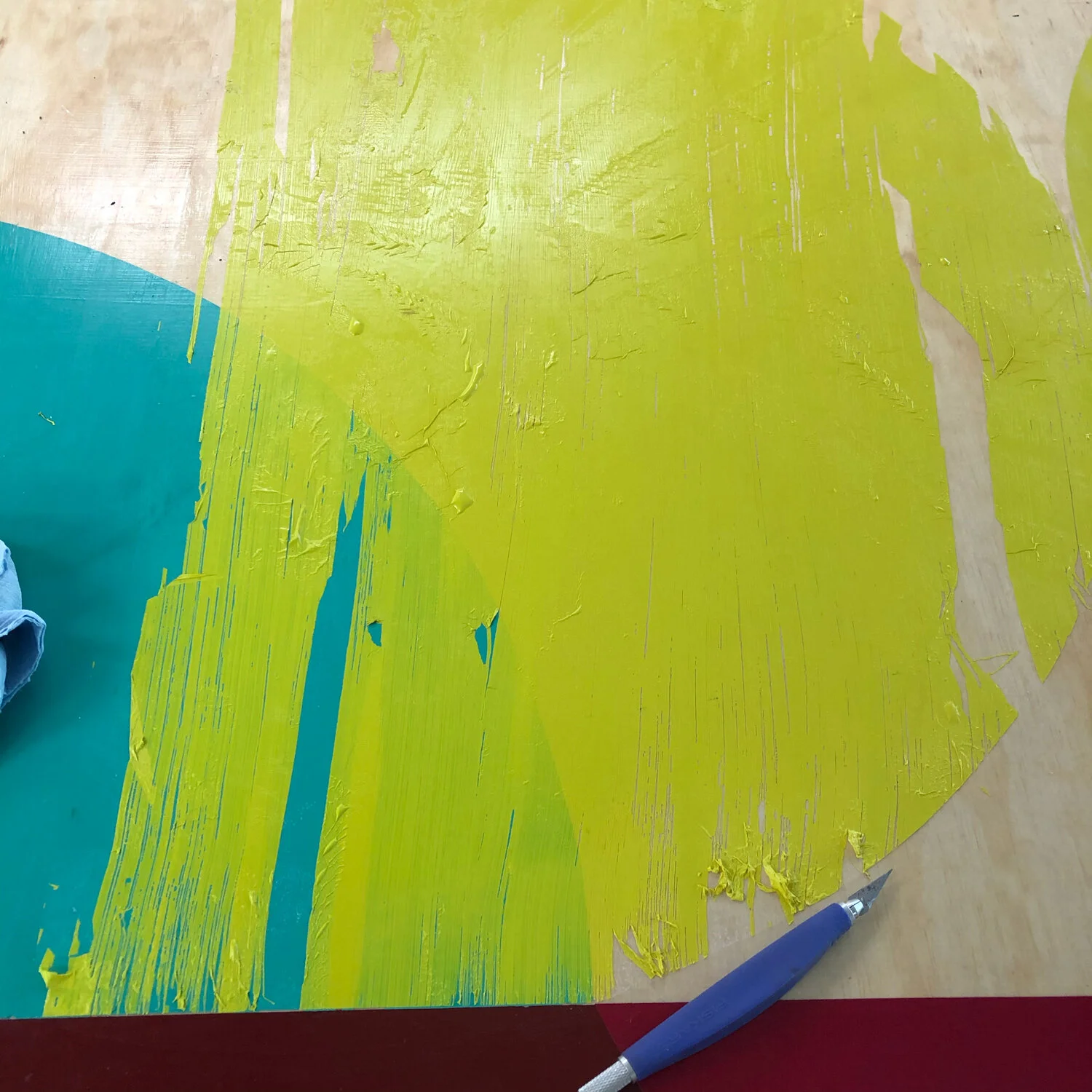 I’ve been working on scaling up to BIG paintings! With this process it’s quite a challenge. This wood panel is so big I’ve had to put it on the floor so I can play with different shapes and colour AND see what it looks like at the same time. It is lots of fun but the challenges are real.